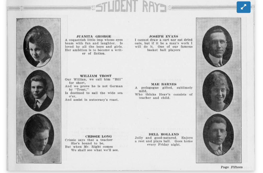 While my great-grandmother Eda wasn’t able to attend Ricks College, her husband William Trost did! He was the valedictorian of his class and graduated in 1918 just before leaving to fight in World War I. As luck would have it, I discovered this page from the Student Rays, the student newspaper for Ricks Academy. It also served as a yearbook of sorts, it appears.